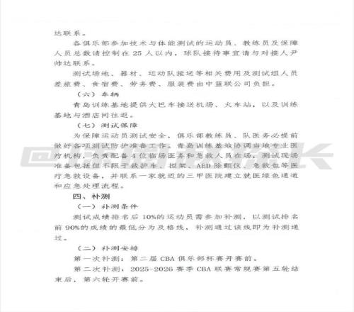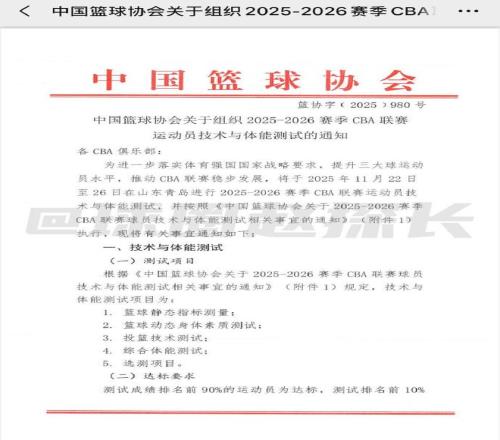 北京时间今日,据国内篮球媒体人“球圈赵探长”社媒消息,中国篮协已向CBA各俱乐部下发新赛季体测通知,体测新规中参加体测的综合排名后10%成绩的球员算未达标。