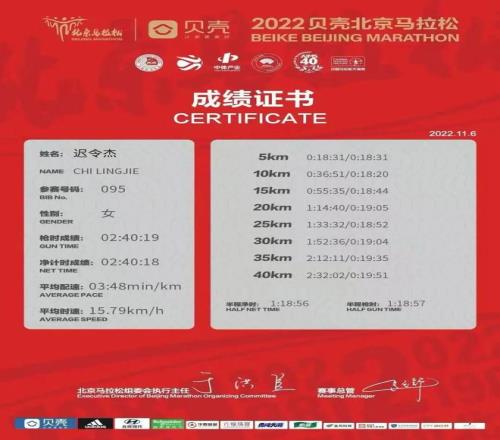 “那是我人生中,我认为最全力以赴的一场跑步。”她回忆道。迟令杰在最后一百米的冲刺中,硬是跑赢了马拉松名将李美珍,最终,她的冲线成绩定格在2小时34分。