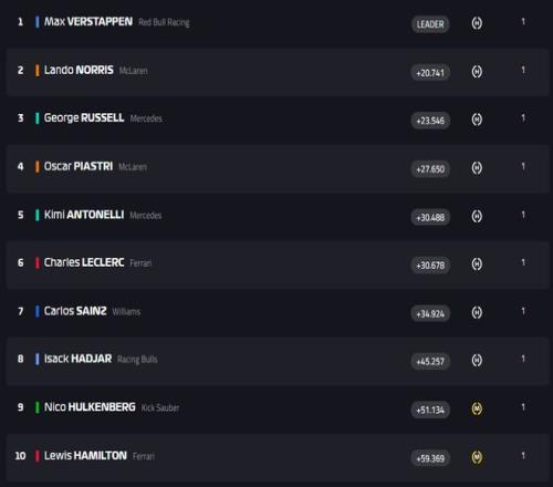 安东内利第四个冲线,但因罚时排名下滑,此后几名冲线的分别是:皮亚斯特里、勒克莱尔、塞恩斯、哈贾尔、霍肯伯格和汉密尔顿。