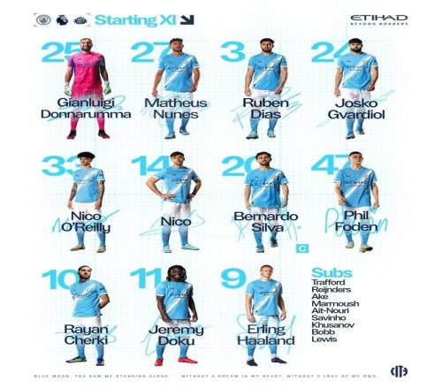 曼城首发:25-多纳鲁马、27-努内斯、3-鲁本-迪亚斯、24-格瓦迪奥尔、3-尼科-奥赖利、14-尼科-冈萨雷斯、20-伯纳多-席尔瓦、47-福登、10-谢尔基、11-多库、9-哈兰德