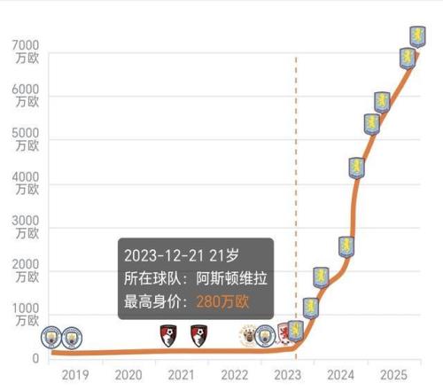 2024年2月,阿斯顿维拉以940万欧元转会费将其签下,他在埃梅里的悉心调教下迅速成长,从首赛季的16场3球1助,到上赛季54场14球13助上双,本赛季更是成为了球队重要的争冠核心!