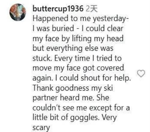 “昨天,我也遇到了这样的事——我被埋了——我抬起头,能把脸露出来,但身体的其他部位都被困住了。每次我试着动一下,脸又会被雪盖住。我大声呼救。谢天谢地,我的滑雪搭子听到了我的声音。她只能看见我的一小块护目镜。太可怕了。”